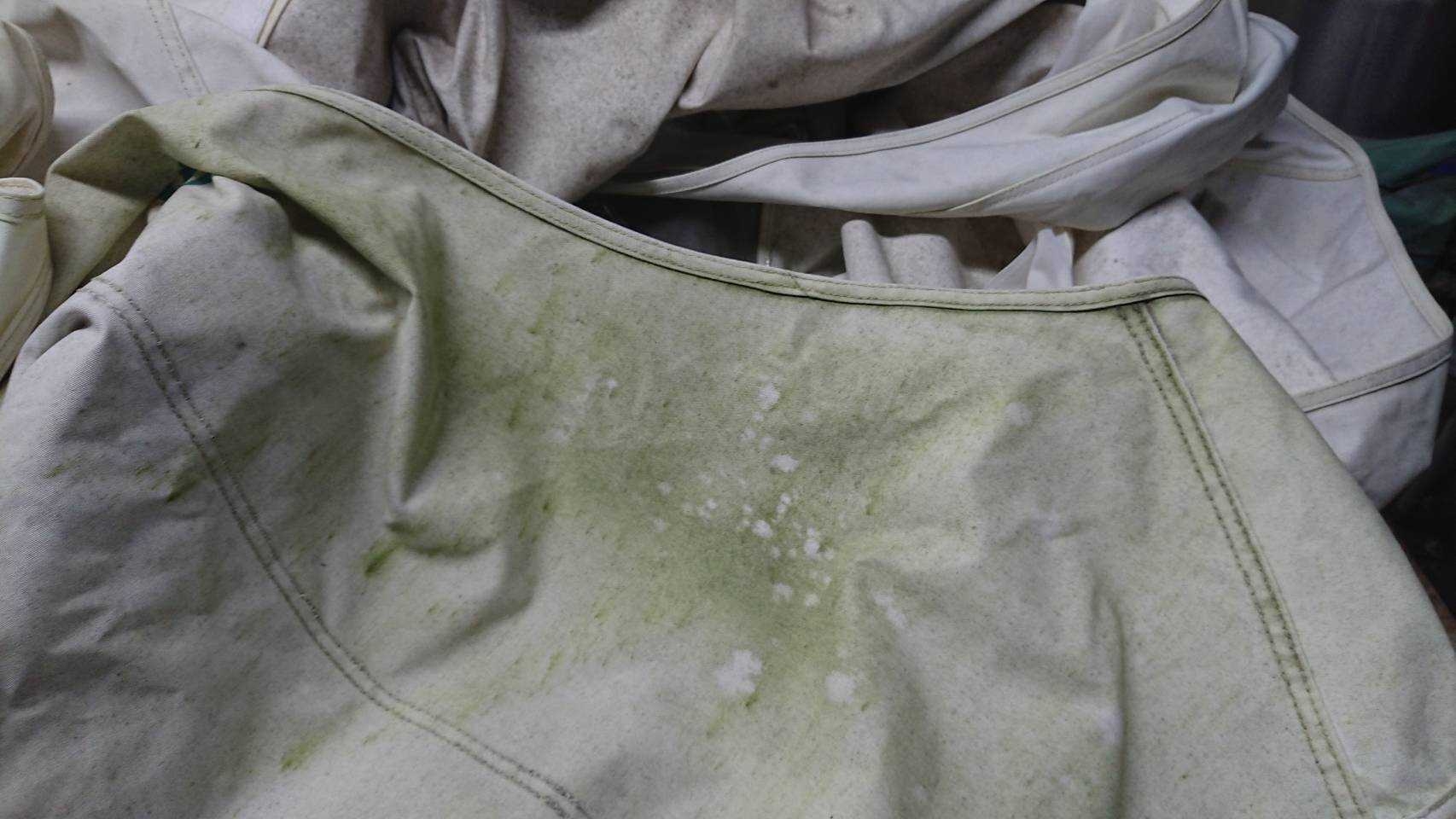 (3)先ほど作った溶液を浸した雑巾で、テントのカビが生えている部分を軽くたたきながら洗剤を付けていきます。