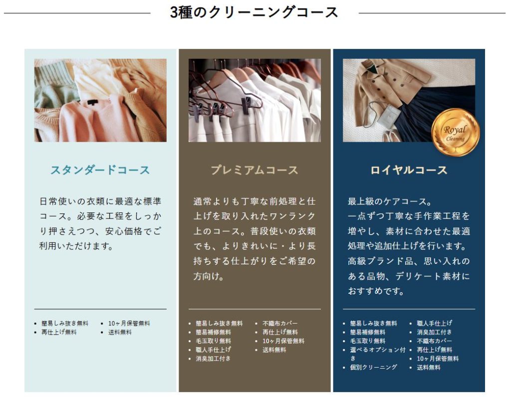 お手頃な「スタンダード」、丁寧な「プレミアム」、最上級の「ロイヤル」の3種類から、衣類に合わせた最適なケアをお選びいただけます。